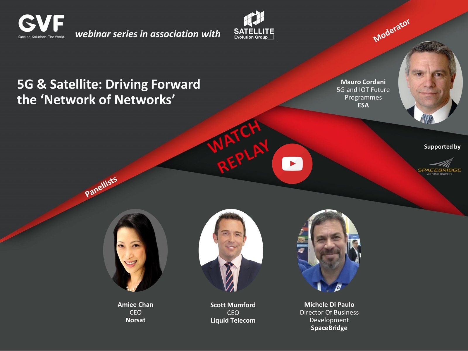 Featuring panellists from varied GVF member organisations – Norsat International (a leading provider of innovative communication solutions that enable the transmission of data, audio and video for remote and challenging applications, with products and services including customisable satellite components, portable satellite systems, maritime solutions and satellite networks), SpaceBridge (a global market leader in broadband satellite communications systems technology, developing and providing satellite network equipment and services, including VSAT HUBs and Terminals for Point-to-Point, Point-to-Multi-Point, and Mesh typologies, as well as SCPC and broadcast modems for GEO and NGSO satellite constellations), and Liquid Telecom (a leading independent data, voice and Internet Service provider, specialising in supplying wholesale satellite and international carrier services to independent mobile and fixed telecommunications operators in developing countries) – and moderated by an expert in 5G and IoT from the European Space Agency, the topic of the integral relationship of 5G and satellite generated a thematically broad discussion, as well as prompting a large amount of attendee questioning from a worldwide audience of hundreds.