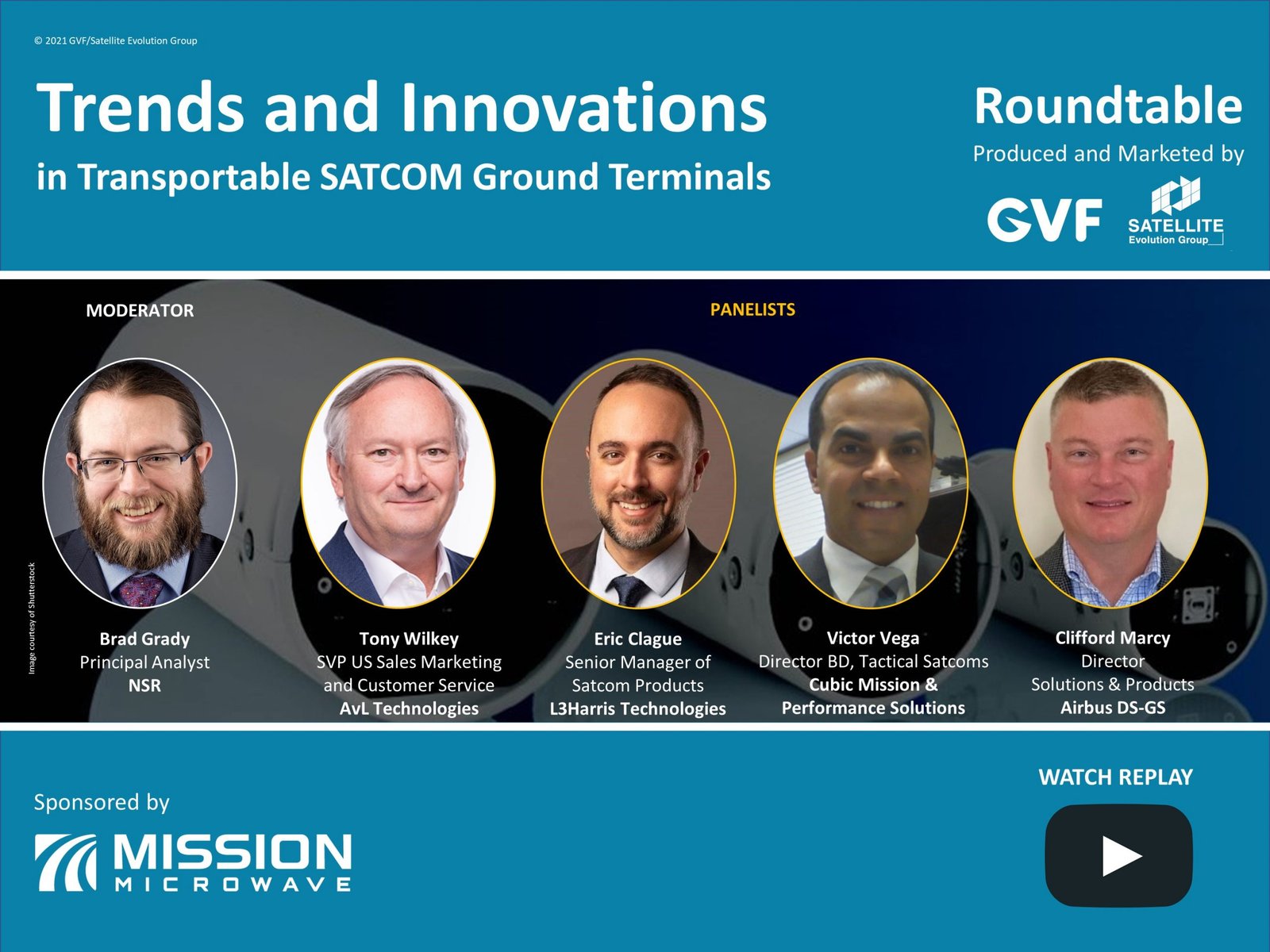 This Mission Microwave supported Roundtable in the GVF-Satellite Evolution Group (GVF-SEG) online event series brought together some of the satellite industry’s globally recognised leaders in the design, build and deployment of transportable SATCOM ground terminals. These specialised terminals are used for different tactical, expeditionary, disaster recovery and temporary capacity applications and deployments for government, military and commercial networks. With a highly engaged audience, numbering just short of 300 from 60 countries, over 30 questions in addition to the moderator’s questions were posed to panellists. Represented on the panel moderated by NSR, were AvL Technologies, L3Harris Technologies, Cubic Misson & Performance Solutions and Airbus Defence & Space-Government Solutions. The discussion covered a wide range of themes starting with trends affecting current business, including the effects of the continuing pandemic. The panellists discussed satellite terminals from the point of view of the “user experience”, with the panel exploring contrasts between the contemporary predominance of the “holistic” view of the terminal, as opposed to the legacy of considering as quite separate the antenna, the BUC, the amplifier, etc. – a transition from looking at the parts to looking at wholly integrated systems, from thinking of technical elements to focusing on systems and services.